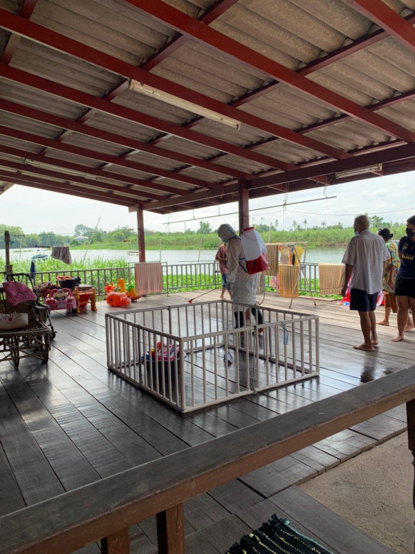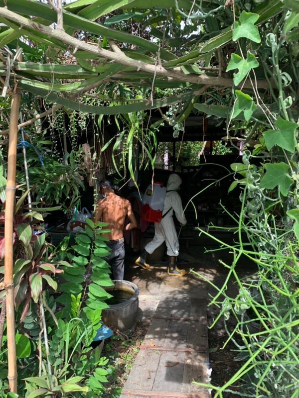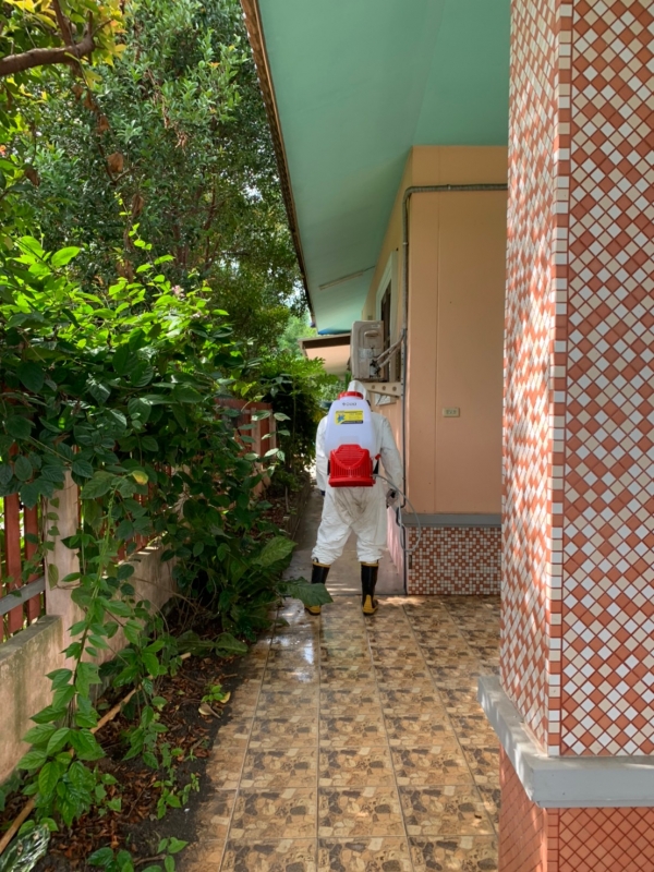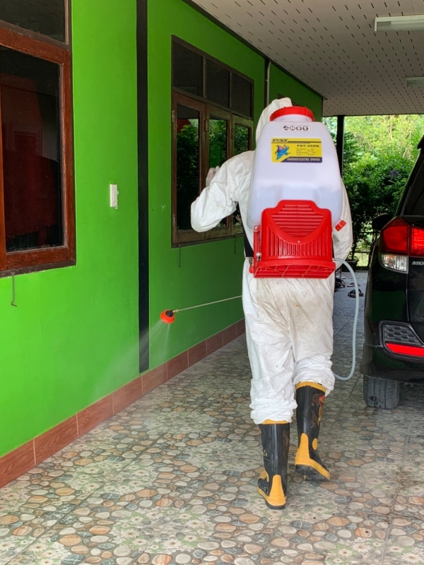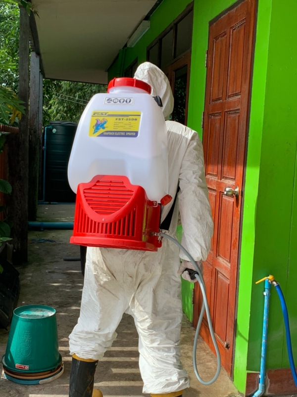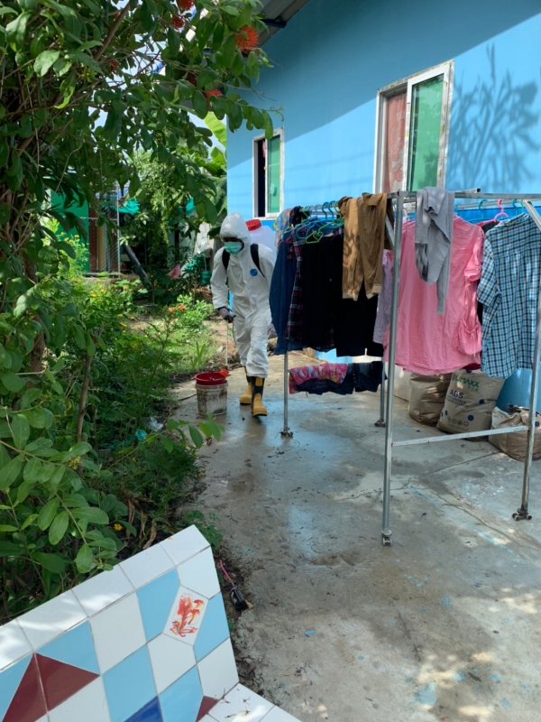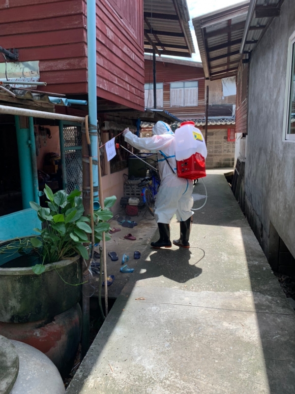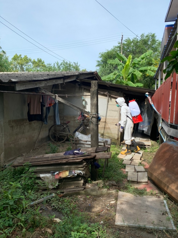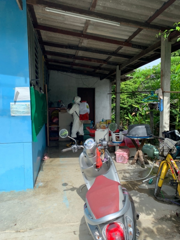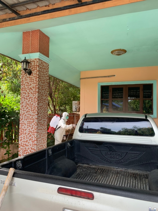 พ่นฆ่าเชื้อป้องกันการแพร่ระบาดของเชื้อไวรัสโคโรน่า 2019 บริเวณบ้านผู้เสี่ยงสูง หมู่ที่ 4