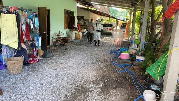 พ่นฆ่าเชื้อป้องกันการแพร่ระบาดของเชื้อไวรัสโคโรน่า 2019 (COVID - 19) บริเวณบ้านและที่ทำงานของผู้เสี่ยงสูง ม.1