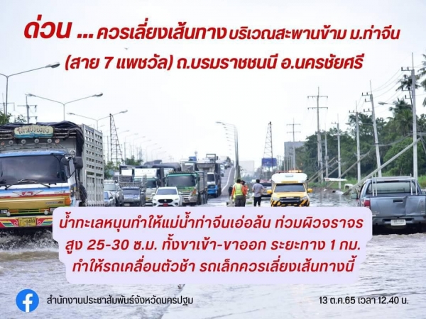 จังหวัดนครปฐม แจ้งประชาสัมพันธ์ให้ประชาชนเลี่ยงเดินทางเส้นทางบริเวณสะพานข้ามแม่น้ำท่าจีน สาย 7 แพชวัล เนื่องจากน้ำทะเลหนุนทำให้แม่น้ำท่าจีนเอ่อล้น ท่วมผิวจราจร