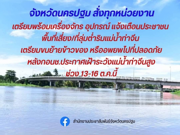 จังหวัดนครปฐม ประชาสัมพันธ์แจ้งเตือนเฝ้าระวังแม่น้ำท่าจีนสูง ช่วงวันที่ 13 - 16 ตุลาคม นี้