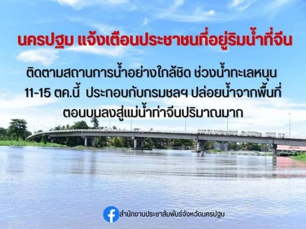 จังหวัดนครปฐม แจ้งเตือนประชาชนที่อยู่ริมแม่น้ำท่าจีน ติดตามสถานการณ์น้ำอย่างใกล้ชิด ในช่วงวันที่ 11-15 ตุลาคมนี้