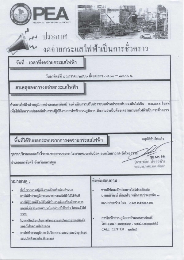 สาเหตุของการงดจ่าย: การไฟฟ้าส่วนภูมิภาคอำเภอนครชัยศรี จะดำเนินการปรับปรุงระบบจำหน่ายระดับแรงดันไม่เกิน 22,000 โวลท์