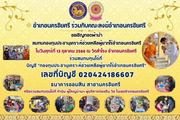 ร่วมสมทบทุนได้ที่บัญชี "กองทุนประชานุเคราะห์ช่วยเหลือผู้ยากไร้อำเภอนครชัยศรี"