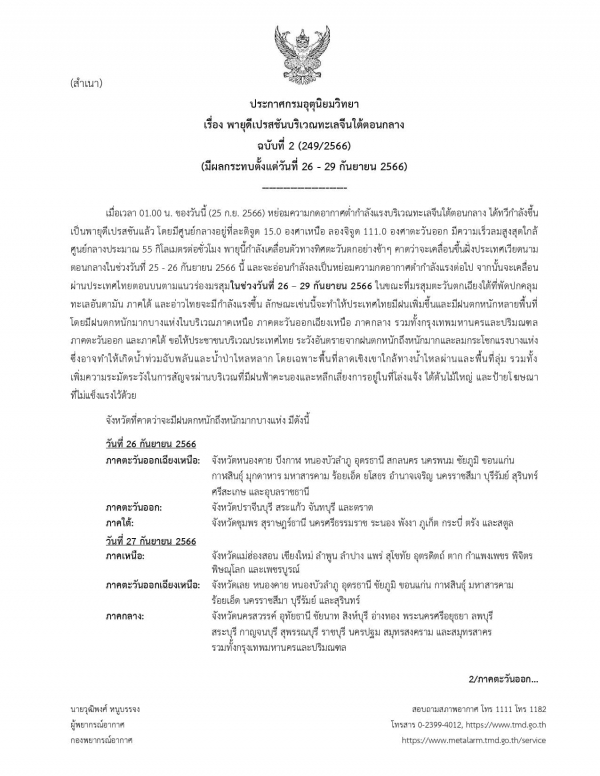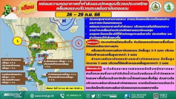 แจ้งเตือนพายุดีเปรสซันบริเวณทะเลจีนใต้ตอนกลาง มีผลกระทบในวันที่ 26 - 29 กันยายน พ.ศ. 2566