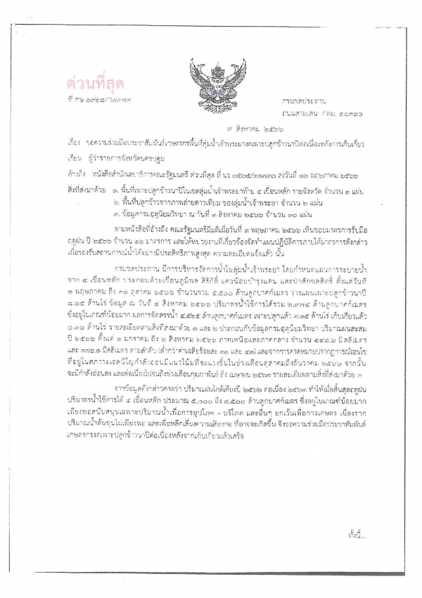 กรมชลประทาน ขอความร่วมมือประชาสัมพันธ์เกษตรกร งดเพาะปลูกข้าวนาปีต่อเนื่องหลังเก็บเกี่ยวในพื้นที่ลุ่มน้ำเจ้าพระยา 22 จังหวัด