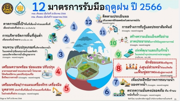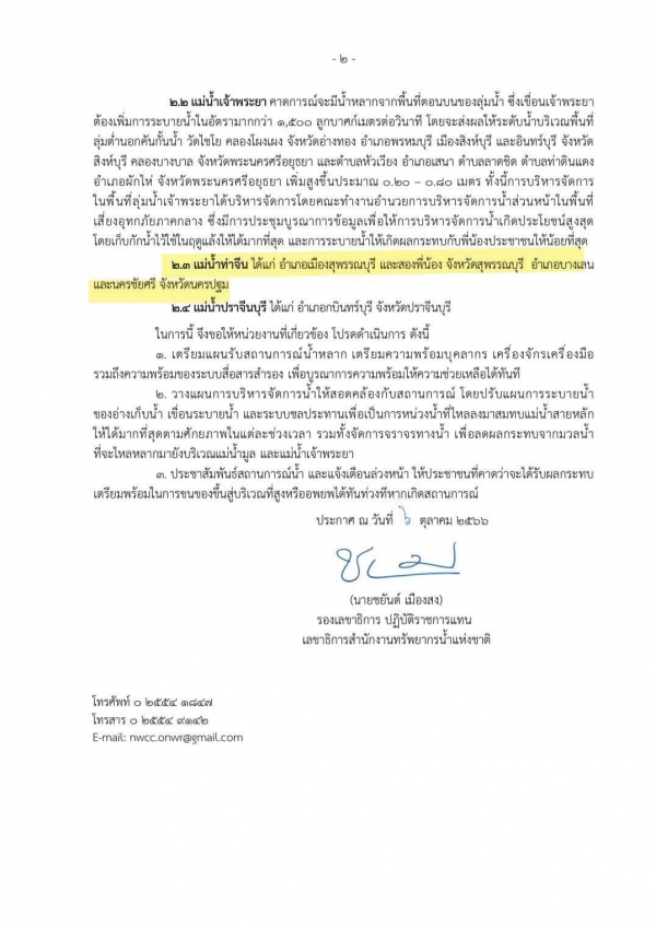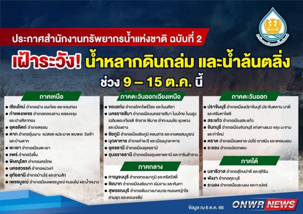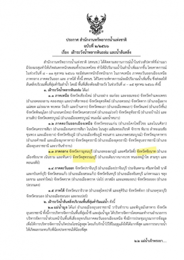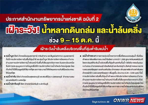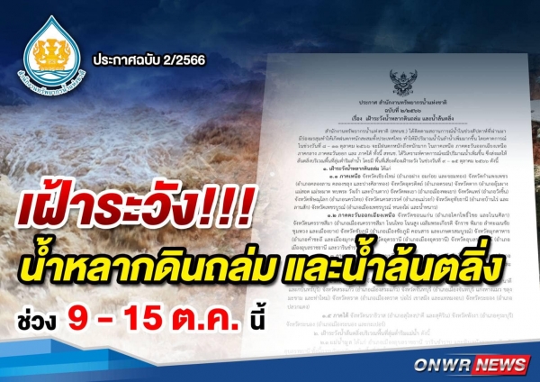 ด้วยสำนักงานทรัพยากรน้ำแห่งชาติได้ออกประกาศ ฉบับที่ 2/2566 เรื่อง เฝ้าระวังน้ำหลาก ดินถล่ม และน้ำล้นตลิ่ง อันเนื่องมาจากร่องมรสุมพาดผ่านประเทศไทย อาจส่งผลให้มีฝนตกหนักถึงหนักมาก ระหว่างวันที่ 8-11 ตุลาคม 2566 ในพื้นที่ภาคเหนือ ภาคกลาง ภาคตะวันออกเฉียงเหนือ ภาคตะวันออก และภาคใต้ ส่งให้มีปริมาณน้ำในลำน้ำเพิ่มขึ้น พื้นที่เสี่ยงในบริเวณลุ่มต่ำ โดยมีพื้นที่เฝ้าระวังระหว่างวันที่ 9-15 ตุลาคม 2566