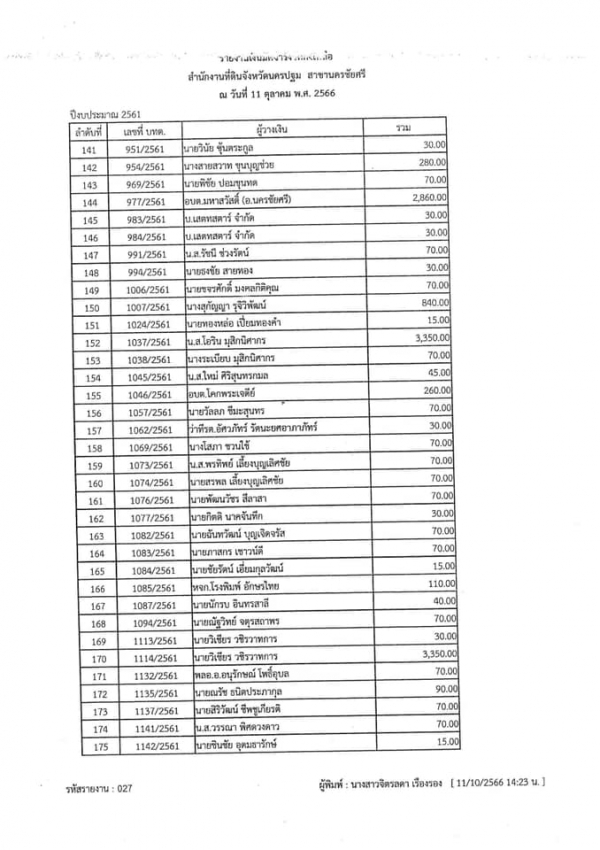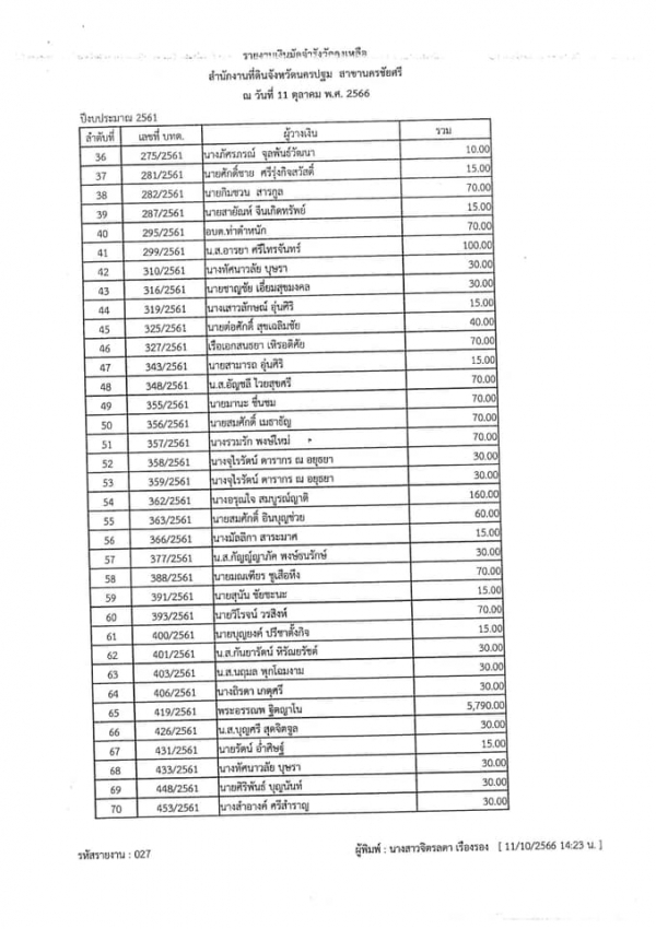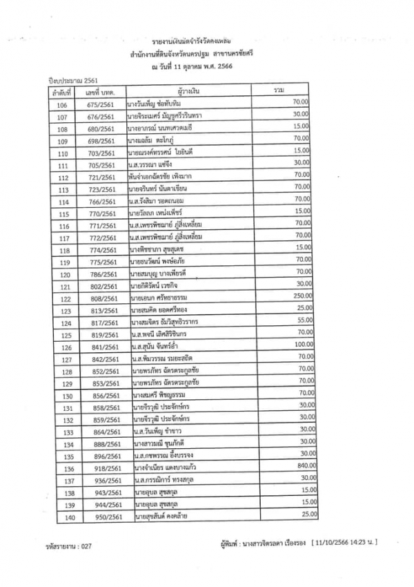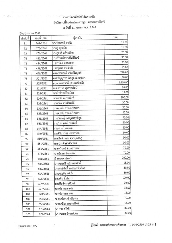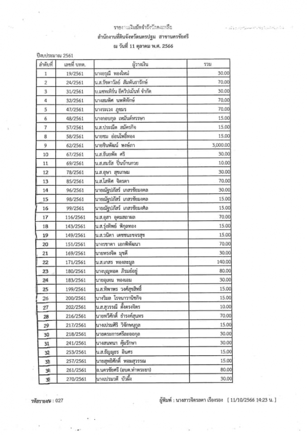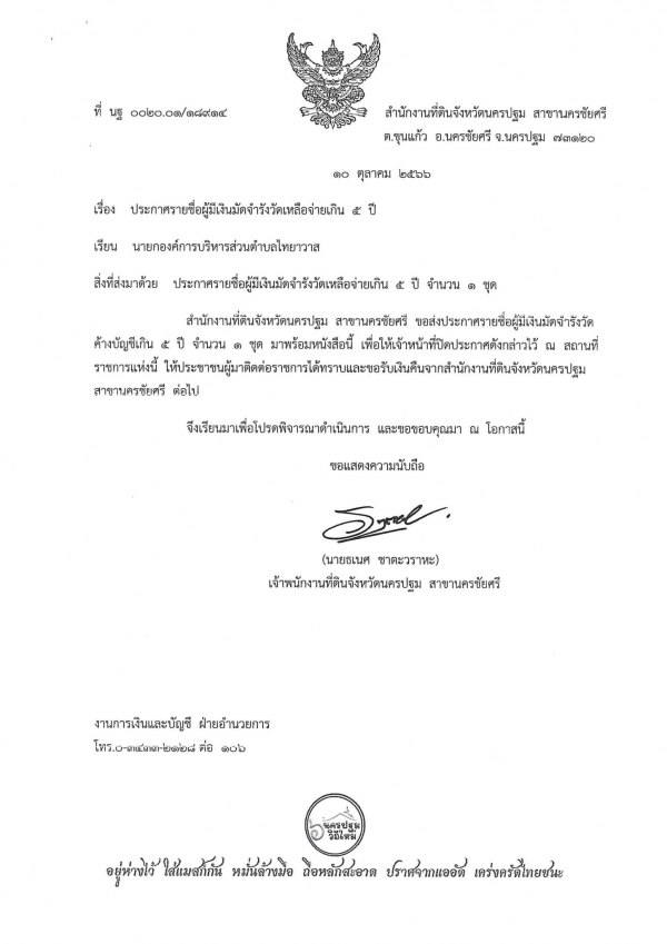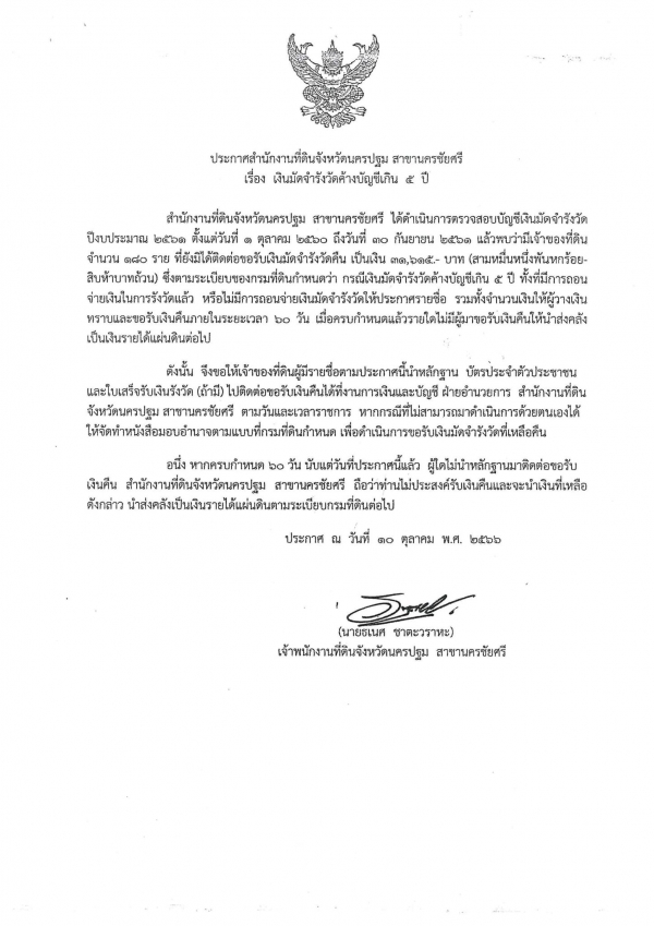 สำนักงานที่ดินจังหวัดนครปฐม ประกาศรายชื่อผู้มีเงินมัดจำรังวัดเหลือจ่ายเกิน 5 ปี