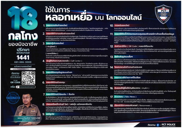 ภัยอาชญากรรมทางเทคโนโลยี 18 กลโกง ของมิจฉาชีพ สามารถปรึกษาหรือแจ้งเบาะแส 1441 หรือโทร 081-886-3000 แจ้งความออนไลน์ www.thaipoliceonline.com