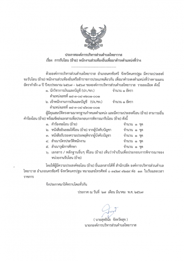 องค์การบริหารส่วนตำบลไทยาวาส ประกาศ รับโอน (ย้าย) พนักงานส่วนท้องถิ่น เพื่อมาดำรงตำแหน่งที่ว่าง จำนวน 2 อัตรา