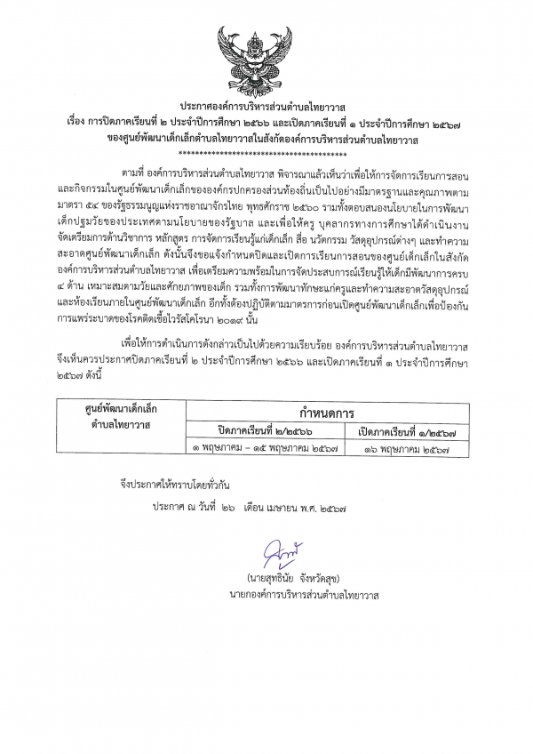 องค์การบริหารส่วนตำบลไทยาวาส ขอประกาศการปิดภาคเรียนที่ 2 ประจำปีการศึกษา 2566 และเปิดภาคเรียนที่ 1 ประจำปีการศึกษา 2567 ของศูนย์พัฒนาเด็กเล็กตำบลไทยาวาส สังกัดองค์การบริหารส่วนตำบลไทยาวาส