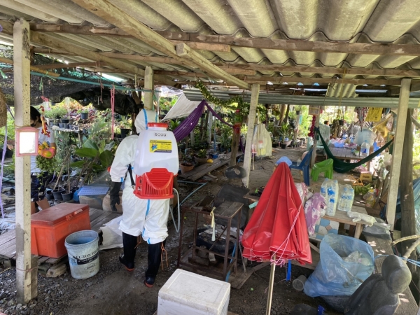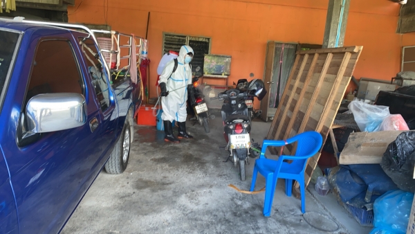 พ่นฆ่าเชื้อป้องกันการแพร่ระบาดของเชื้อไวรัสโคโรน่า 2019 (COVID - 19) บริเวณบ้านและที่ทำงานของผู้เสี่ยงสูง ม.1